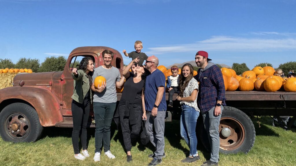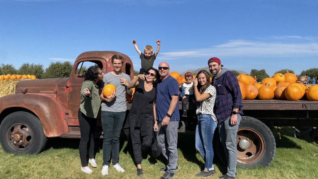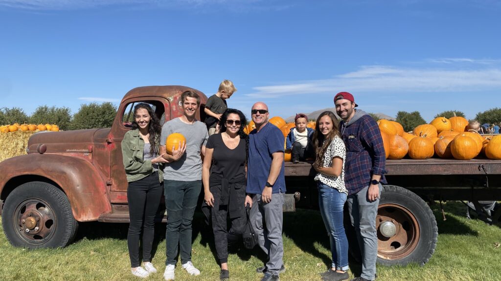 It’s always on a Saturday morning in October. Our family meets down at a place called the Red Barn. We get their homemade apple cider and freshly made apple donuts for breakfast and then we climb aboard a tractor trailer to ride on hail bails out to the pumpkin patch where we explore a corn maze, shoot apples out of cannons at targets, go down the big slide and race around a dirt track on adult size tricycles. Then once the kids have picked out their pumpkins we head over to our favorite sandwich shop and get sourdough turkey BLTAs for lunch together. It’s a family tradition we have done every October since my kids were young and we look forward to it every year.