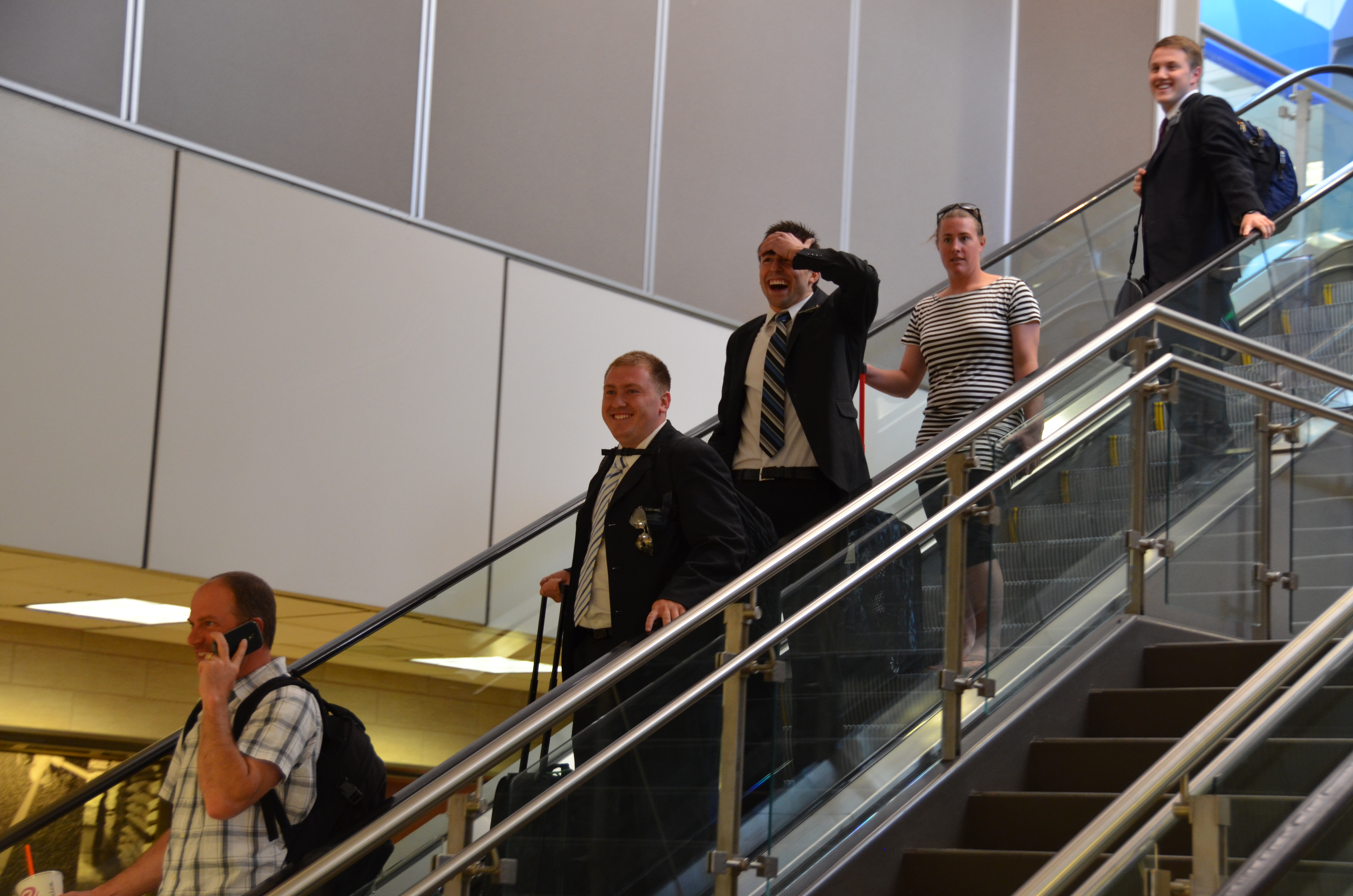 He sees his family and friends (Dalton is the one with his hand on his forehead)