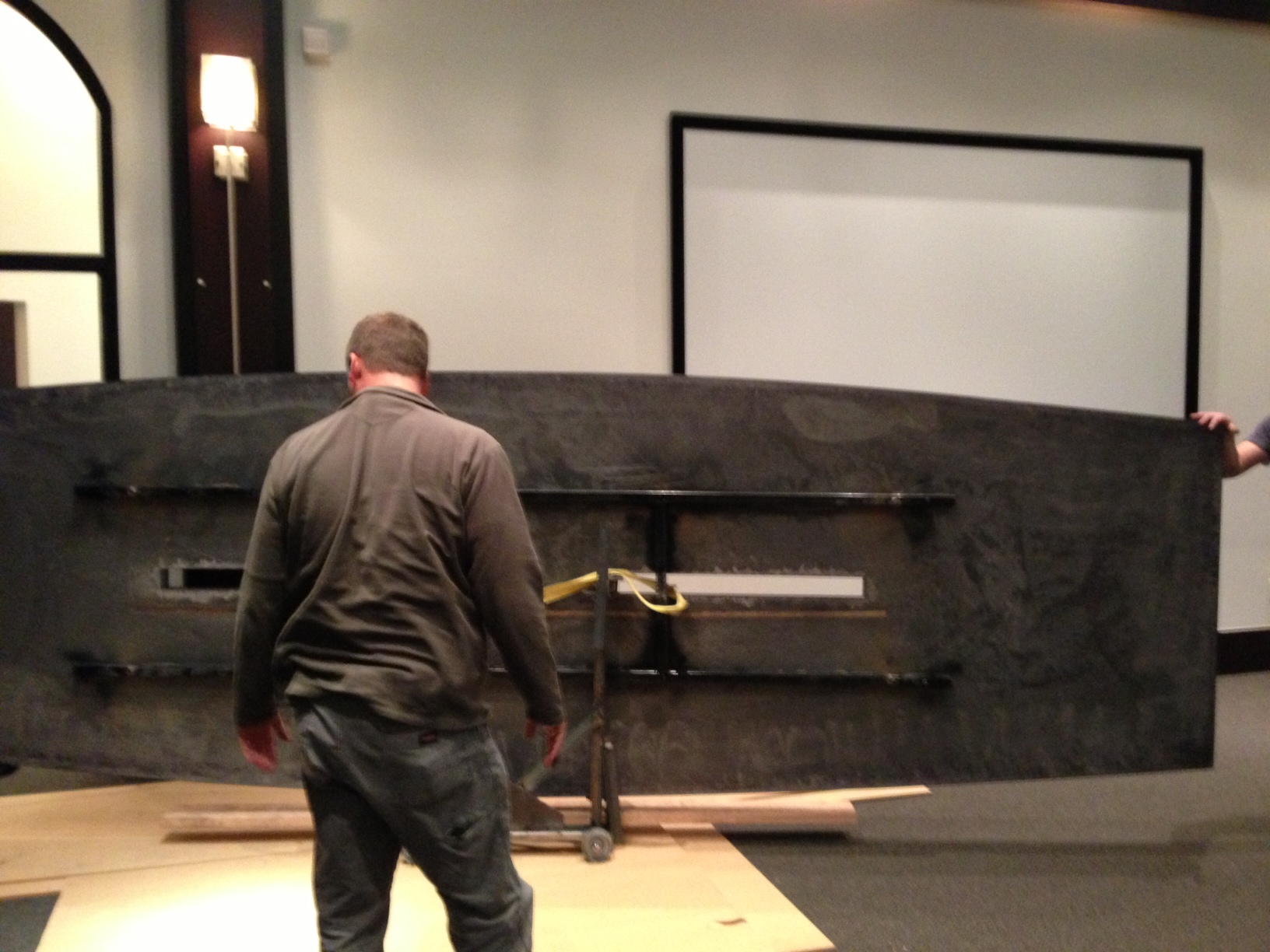 rolling the table into position using mdf boards to protect the carpet from its weight